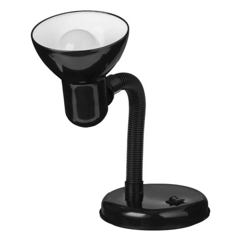 Lampă de birou neagră, echipată cu bec de 3W. Dispune de un braț flexibil, care permite ajustarea ușoară a înălțimii și orientarea luminii exact acolo unde este nevoie. Este prevăzută cu dulie din porțelan, buton de pornire/oprire și cablu de alimentare cu lungimea de 150 cm.