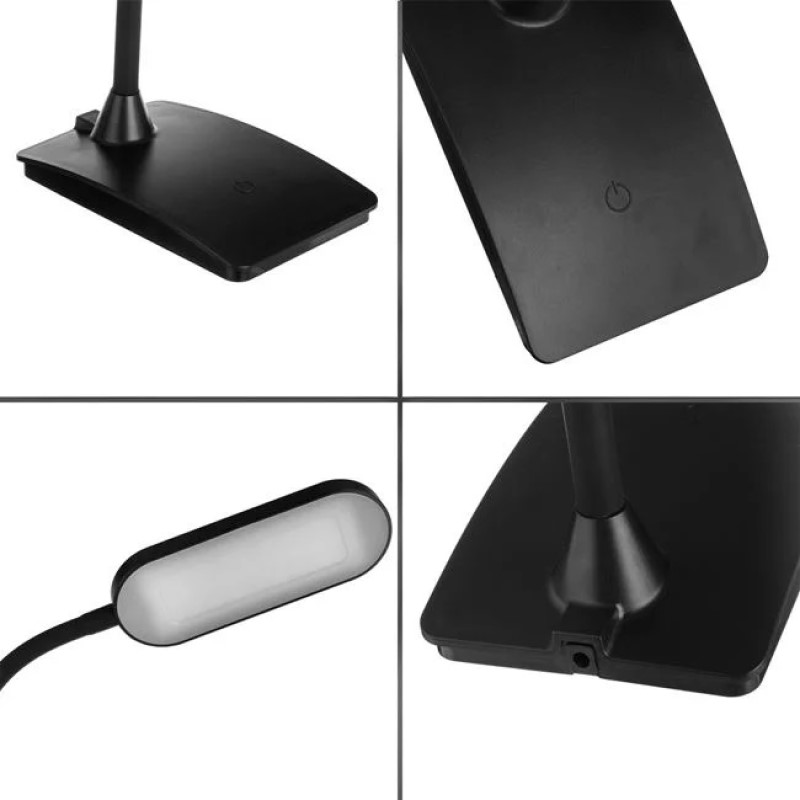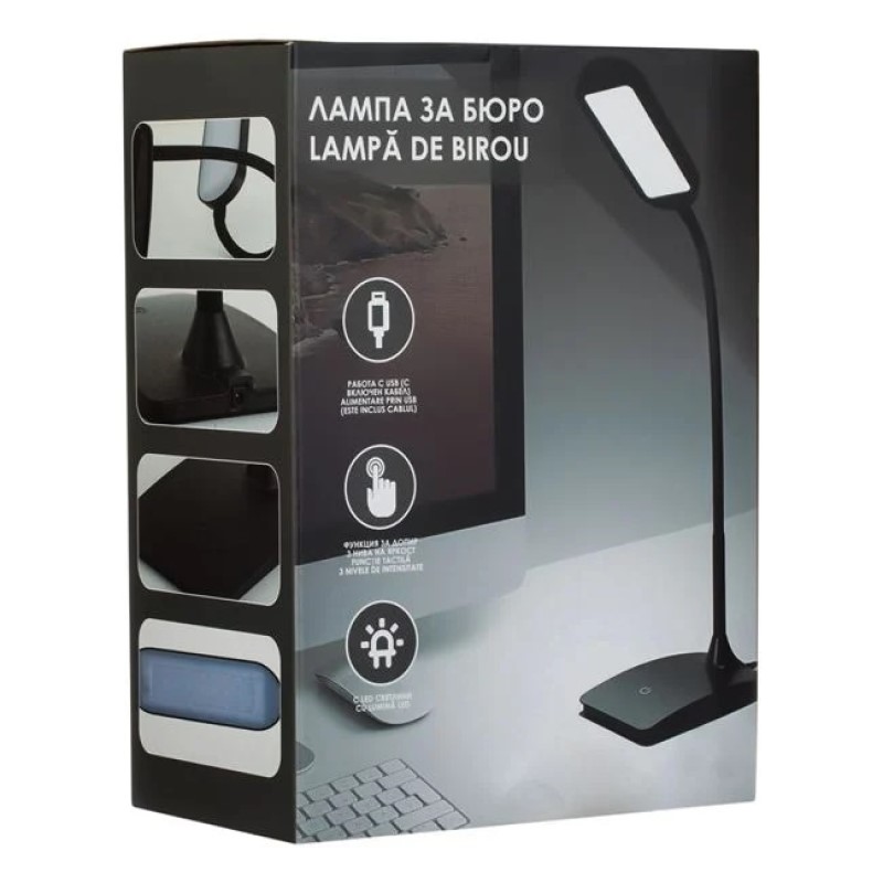 Lampa de birou cu alimentare 5V/1A, de culoare neagră, cu finisaj mat, fabricată din ABS și echipată cu LED-uri. Dispune de funcție tactilă pentru comutare și reglare a celor trei niveluri de lumină, oferindu-vă control complet asupra iluminatului. Brațul flexibil permite ajustarea poziției pentru o iluminare optimă, adaptându-se nevoilor dvs. Funcționează cu cablu USB de 80 cm, inclus în pachet, și vine cu o priză inclusă.