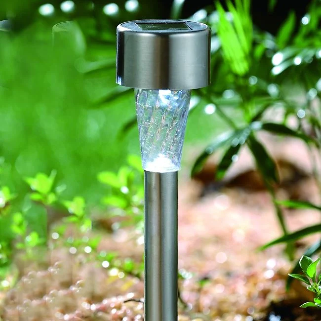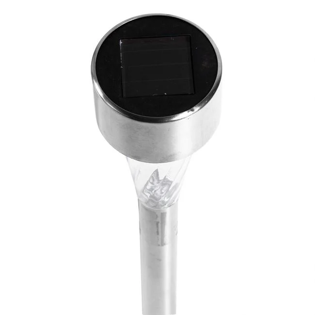 Lampă solară cu design elegant în finisaj argintiu, echipată cu LED alb luminos și baterie reîncărcabilă. Funcționează exclusiv pe bază de energie solară, fără cabluri sau consum de electricitate – o alegere ecologică și economică pentru iluminatul grădinii sau aleilor.