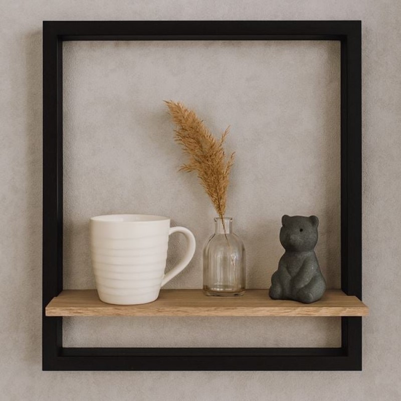 Adaugă un plus de stil și funcționalitate pereților tăi cu acest raft decorativ realizat din lemn de stejar, în nuanțe naturale calde, încadrat elegant într-un cadru metalic negru. Este soluția perfectă pentru expunerea obiectelor decorative, plantelor mici sau cărților preferate.