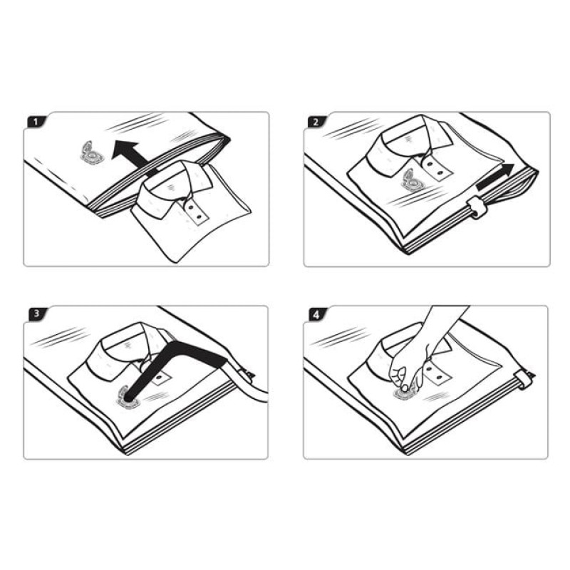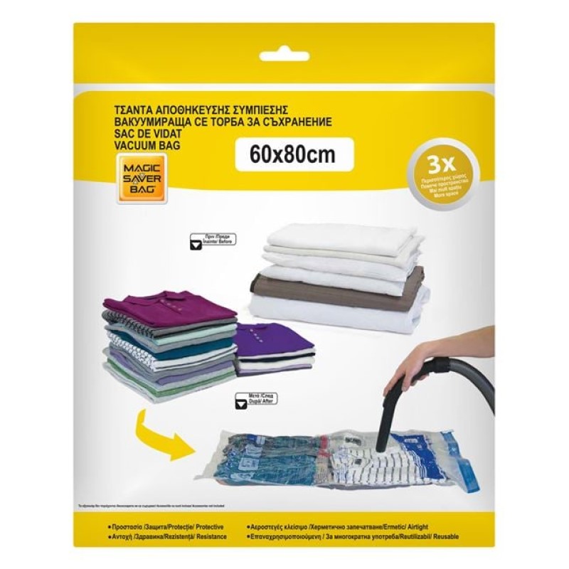 Sac de vidat practic și eficient, care reduce volumul obiectelor depozitate cu până la 75%, economisind considerabil spațiul din dulap sau depozit. Este complet etanș, oferind protecție împotriva prafului, umidității, mirosurilor neplăcute, acarienilor și moliilor.
