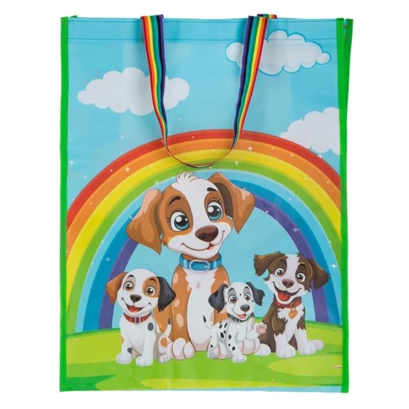 Sacoșă rezistentă și reutilizabilă, prevăzută cu mânere lungi de 22 cm pentru transport facil. Are design imprimat față-verso: pe o parte, un model cu pisicuțe, iar pe cealaltă, căței, ambele pe un fundal vesel cu nori și curcubeu.