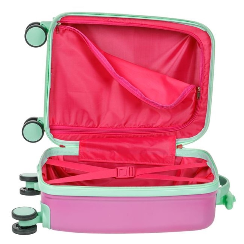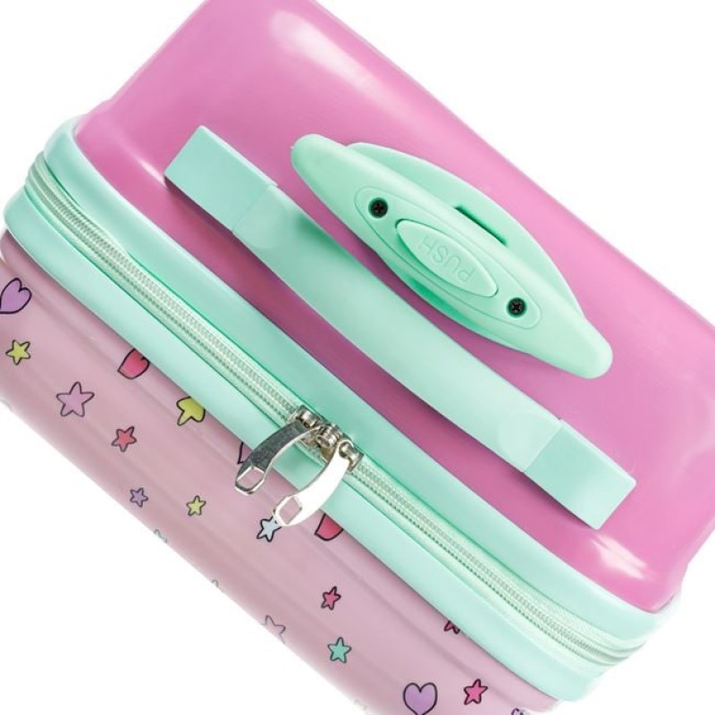 Troler de călătorie pentru fete, cu design vesel unicorn, în nuanțe roz și verde marin. Este prevăzut cu mâner simplu și mâner tip „T”, are o înălțime de până la 85 cm și este echipat cu 4 roți duble rotative pentru manevrare ușoară.